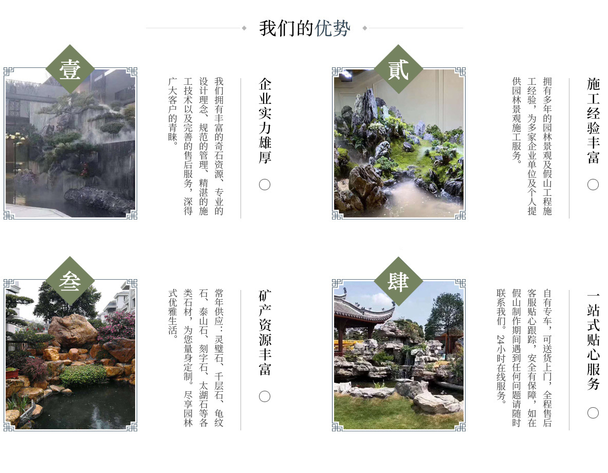 - 安徽豐富園林工程有限公司,坐落于風(fēng)景秀麗的中國(guó)磬石之鄉(xiāng)--安徽省靈璧縣漁溝鎮(zhèn)。公司主要從事開(kāi)采批發(fā)靈璧奇石、景觀(guān)石、龜紋石、千層石、太湖石、草坪石等;承接大、中、小園林,假山和駁岸工程,是一家集設(shè)計(jì),運(yùn)輸,施工等一體化、專(zhuān)業(yè)化公司。公司從事園林假山工程十年之久,經(jīng)驗(yàn)豐富,我們?cè)谥铝τ跒榭蛻?hù)打造精品的同時(shí)更將改善人居環(huán)境、創(chuàng)造生態(tài)宜居園林景觀(guān)為己任,始終堅(jiān)持顧客...